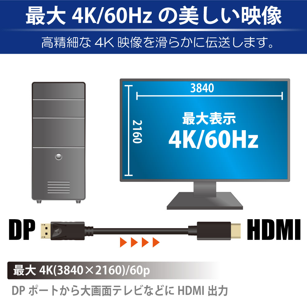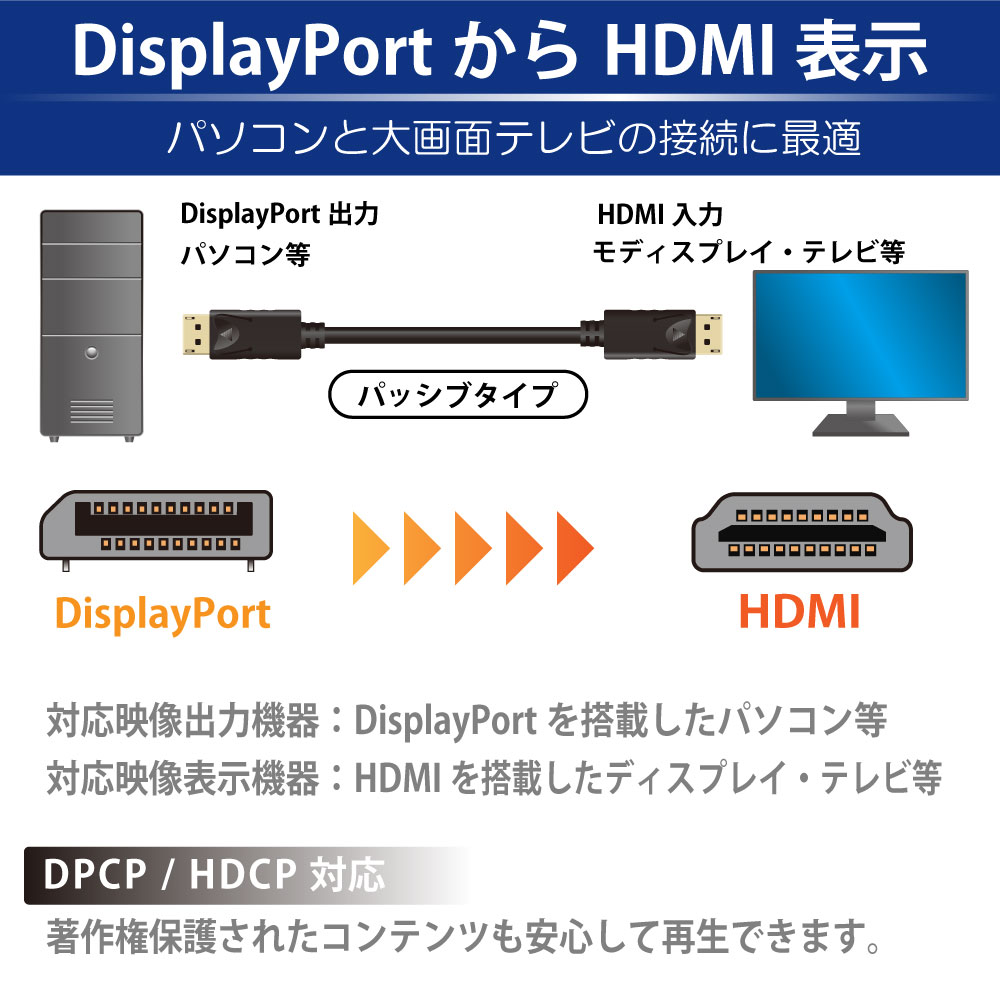 DisplayPort出力端子を搭載したPCと、HDMI入力端子を搭載したディスプレイやテレビを接続するためのDisplayPort-HDMI変換ケーブルです。