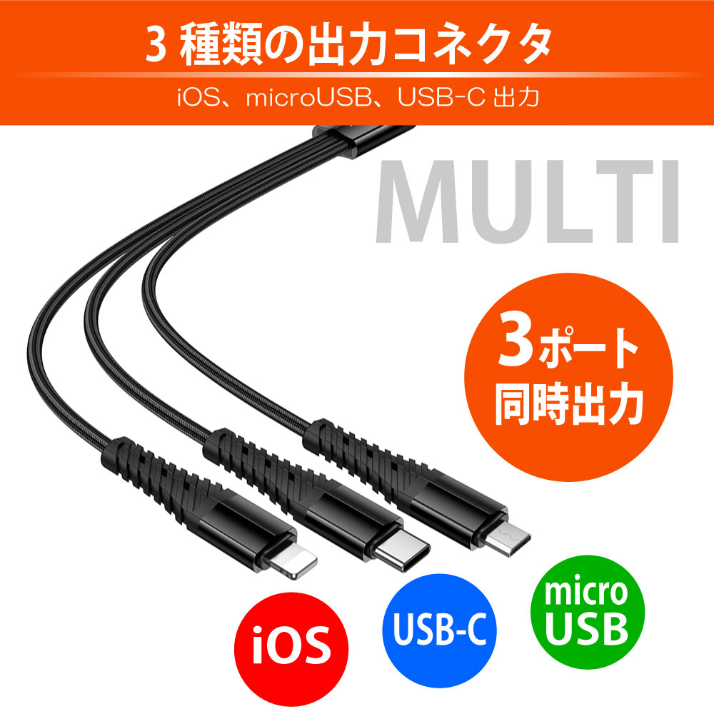 iOS、microUSB、USB-Cコネクタを搭載した3台の機器を同時に充電可能です。