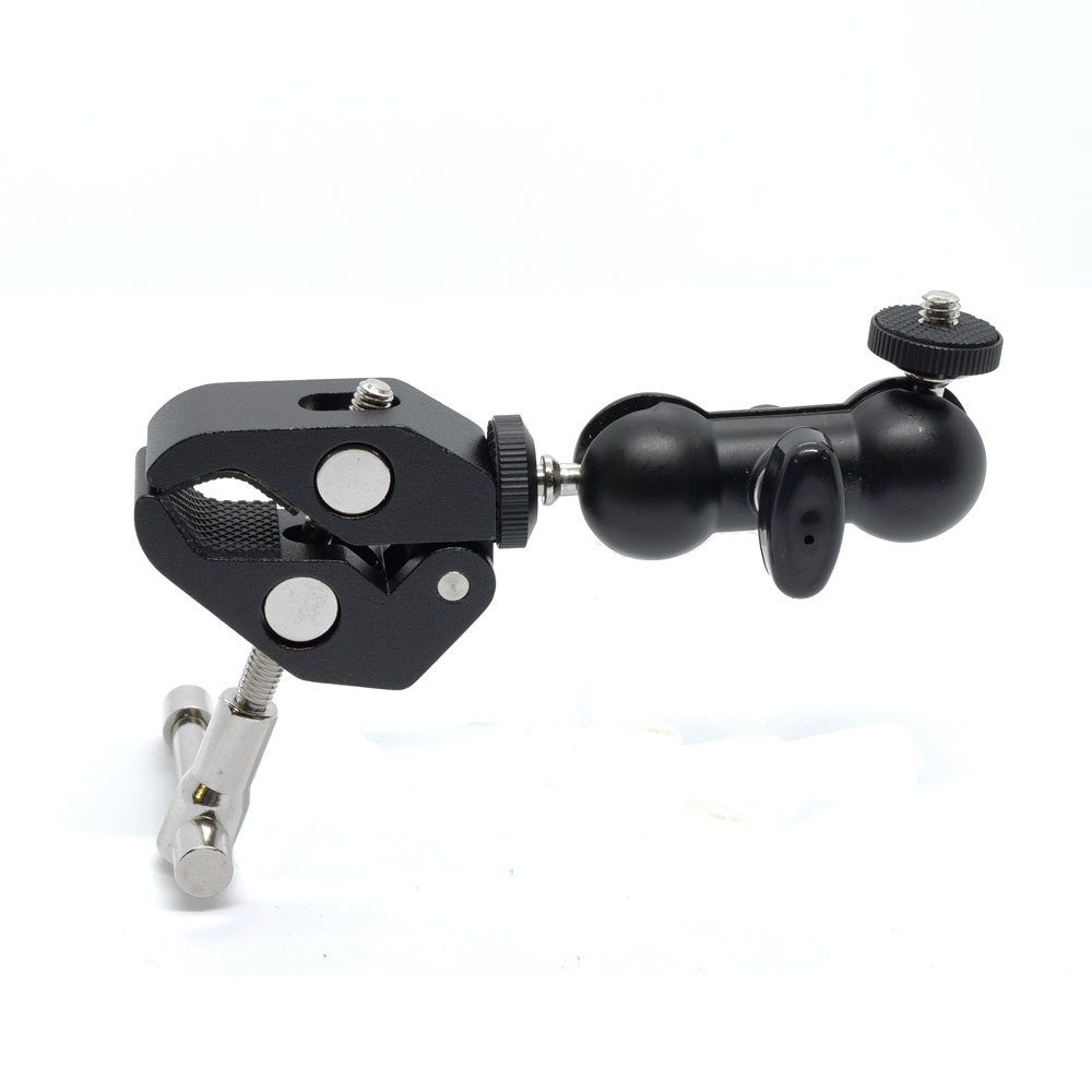 カメラと雲台を本製品に接続し、クランプで様々なものに取り付けて三脚代わりに利用することができます。これによりカメラの設置場所を自由に選べるようになります。