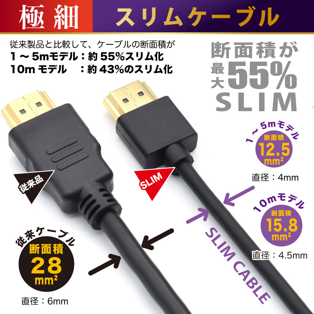 ケーブルの直径は1.0m〜5.0mモデルが約4.0mm、10mモデルが約4.5mmとなり、従来ケーブル(約6mm)と比較して、断面積で最大55%スリム化されました。