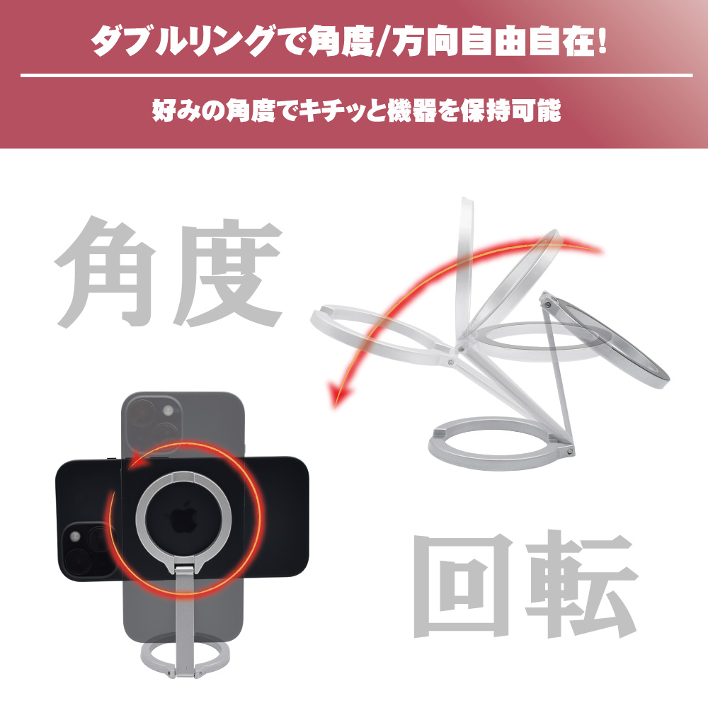 リングを広げてミニマムサイズのマグネットスタンドとして便利。