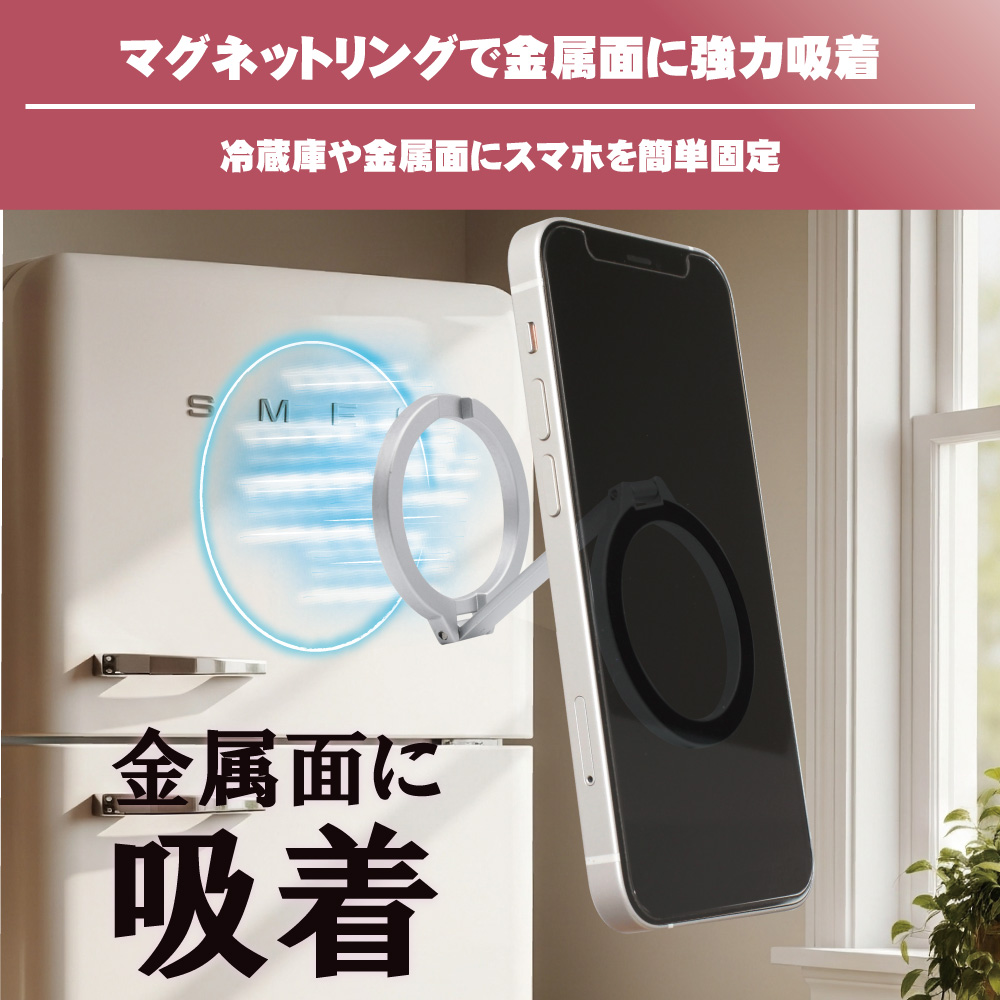 冷蔵庫やスチール棚などの磁性面にスマホを簡単固定。ピタッと強力吸着します。