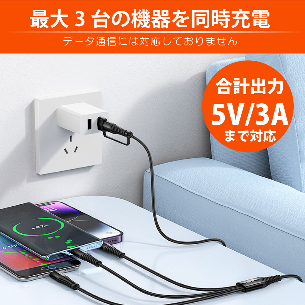 iOS、microUSB、USB-Cコネクタを搭載した3台の機器を同時に充電可能です。