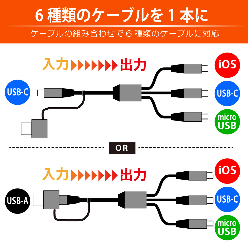 iOS、microUSB、USB-Cの3つ又ケーブルをUSB-AまたはUSB-Cの組み合わせで6種類のケーブルを一本に集約。